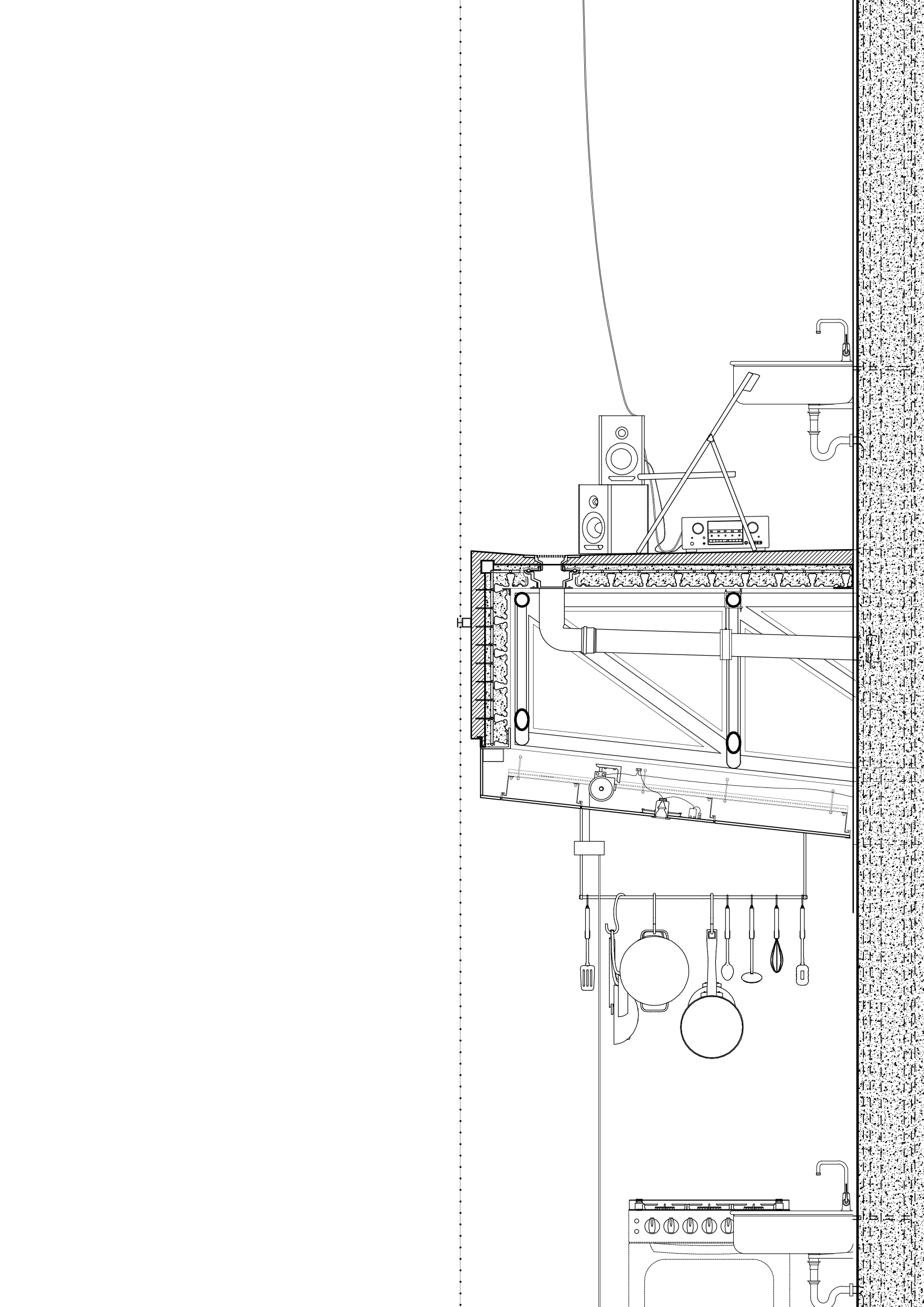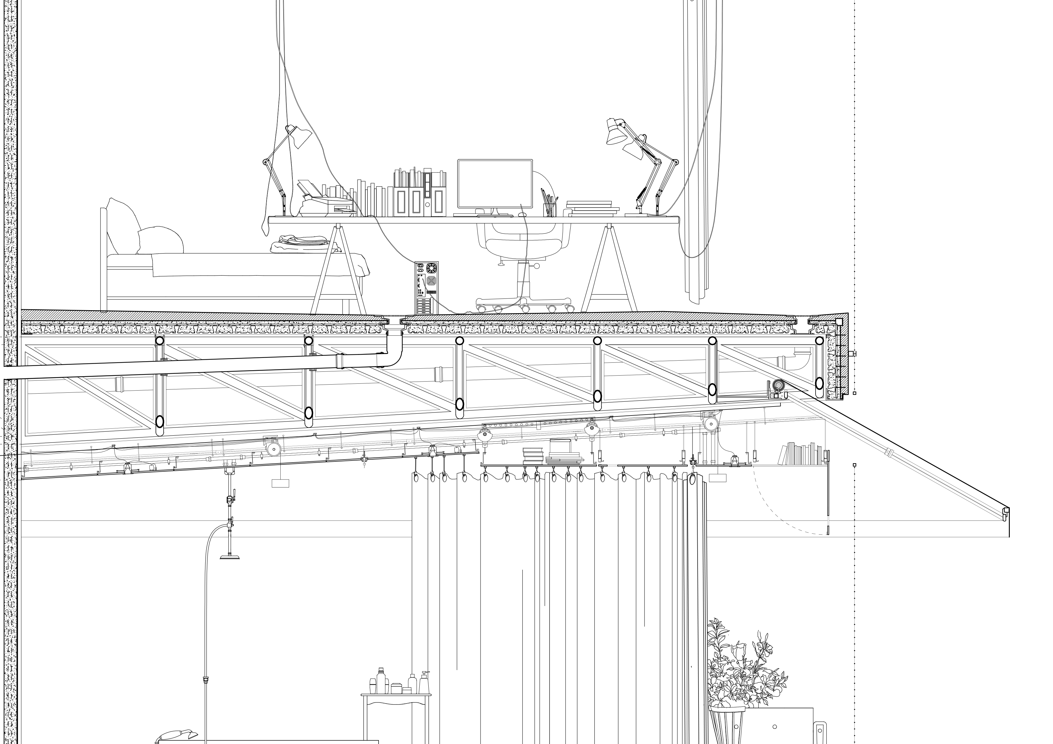 The balcony Home restructures the home as a platform, it is the common space for public and private actions – work, study, leisure, entertainment, and consumption. As water and electrical outlets are no longer program-dependent, the home is liberated from its basic spatial unit – the room, rendering the distinction between private and public, dirty and clean, hidden and visible, and wet and dry obsolete.