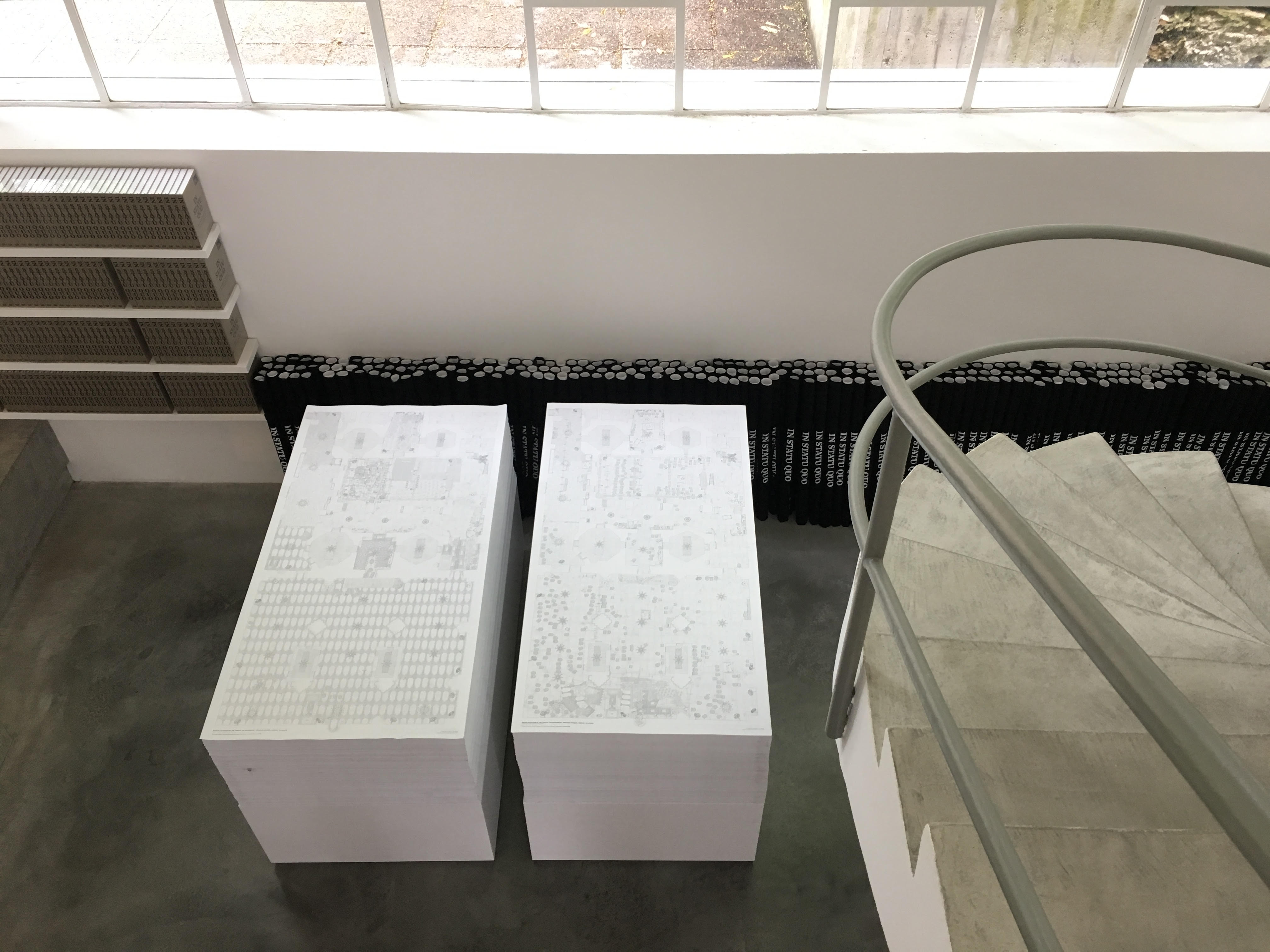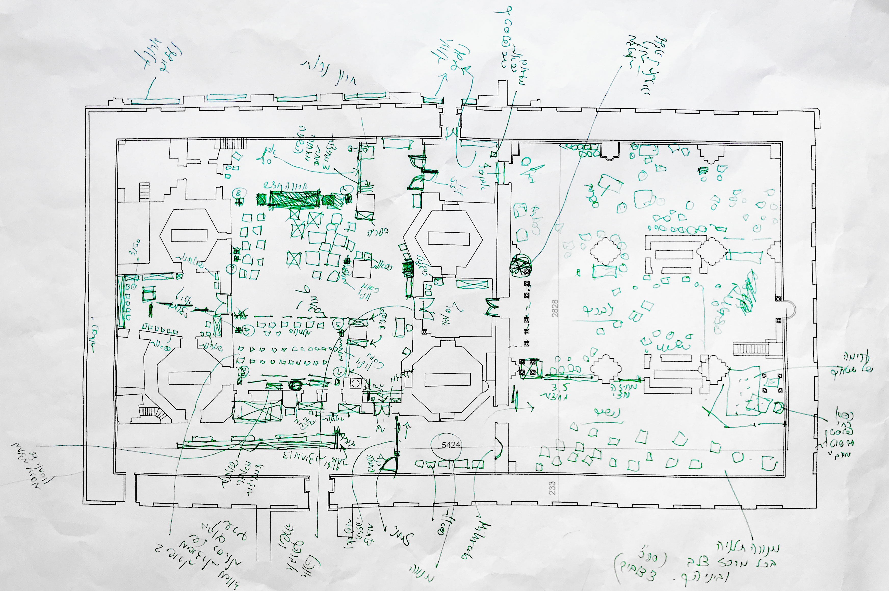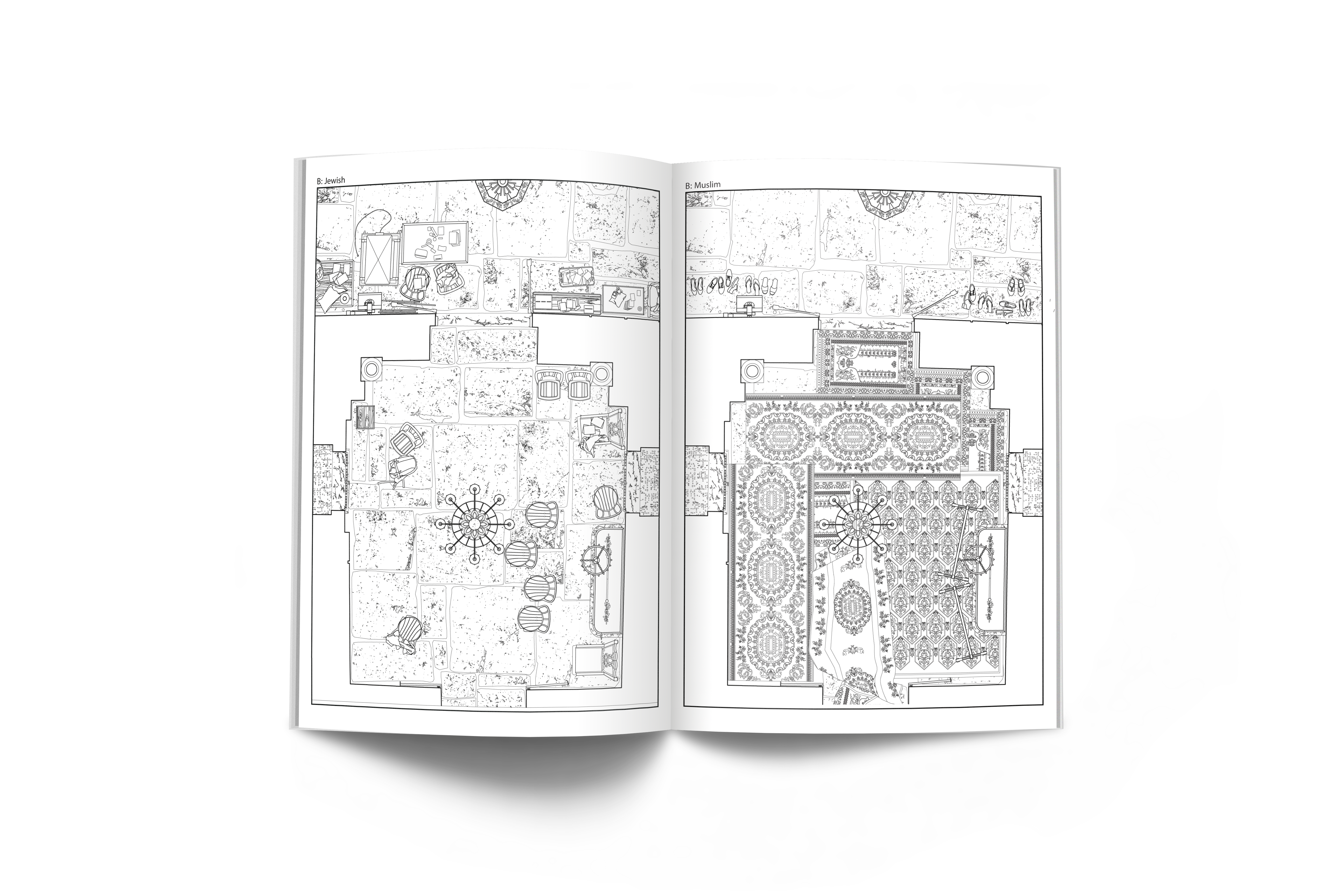 Fieldwork was carried out prior to drawing. The site was carefully measured and documented during Jewish exception when the cave is open exclusively for Jews. From sacred books to generic plastic chairs, every object and its arrangement was studied to show the unique use of interior space. Since entering during Muslim exception was not allowed, the Mosque’s layout was assembled from various formal and informal sources, including websites, social media feeds, and YouTube videos. At times, even the smallest detail hiding in the background of publicly available selfie pictures was used to complete the drawing.