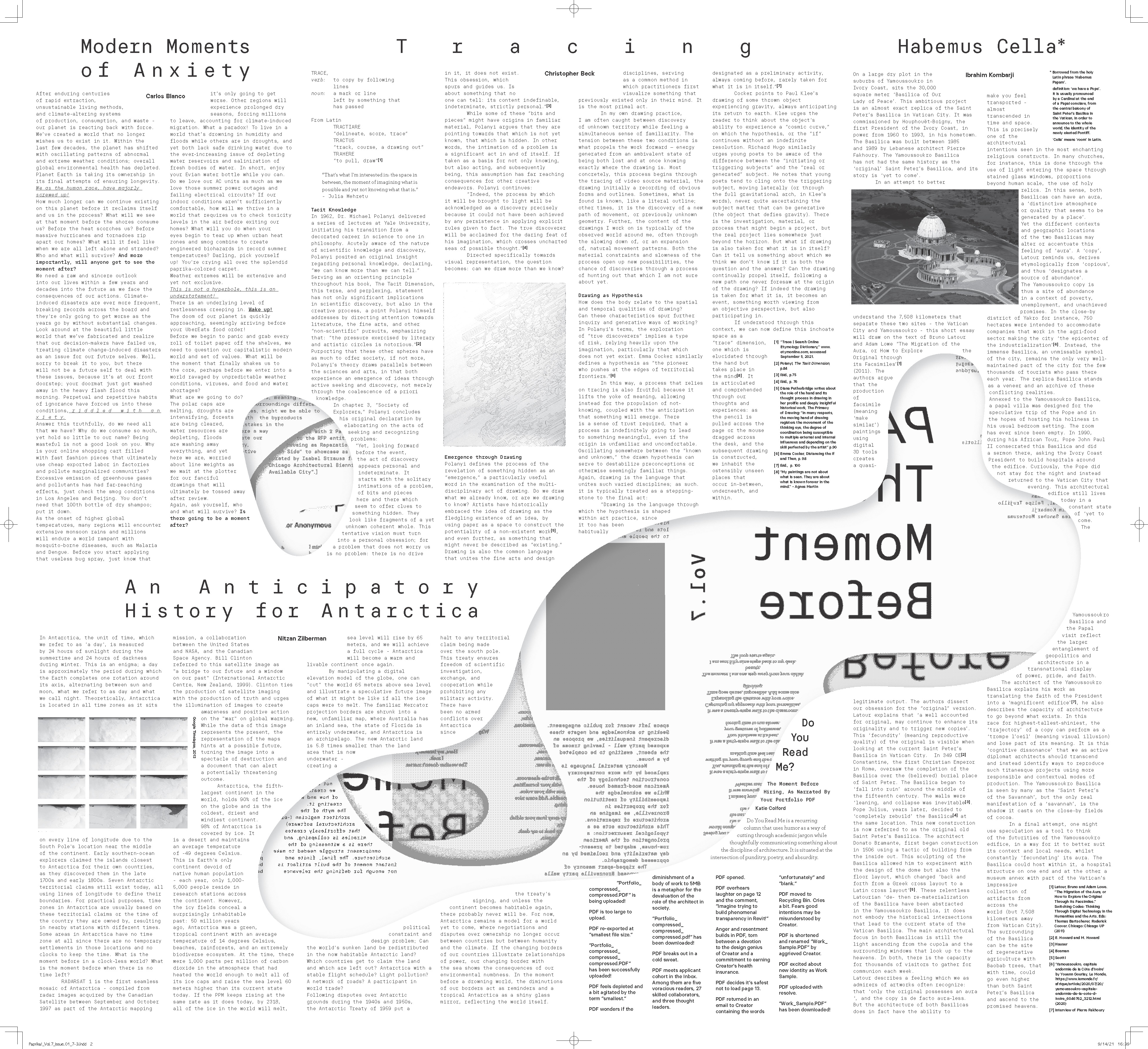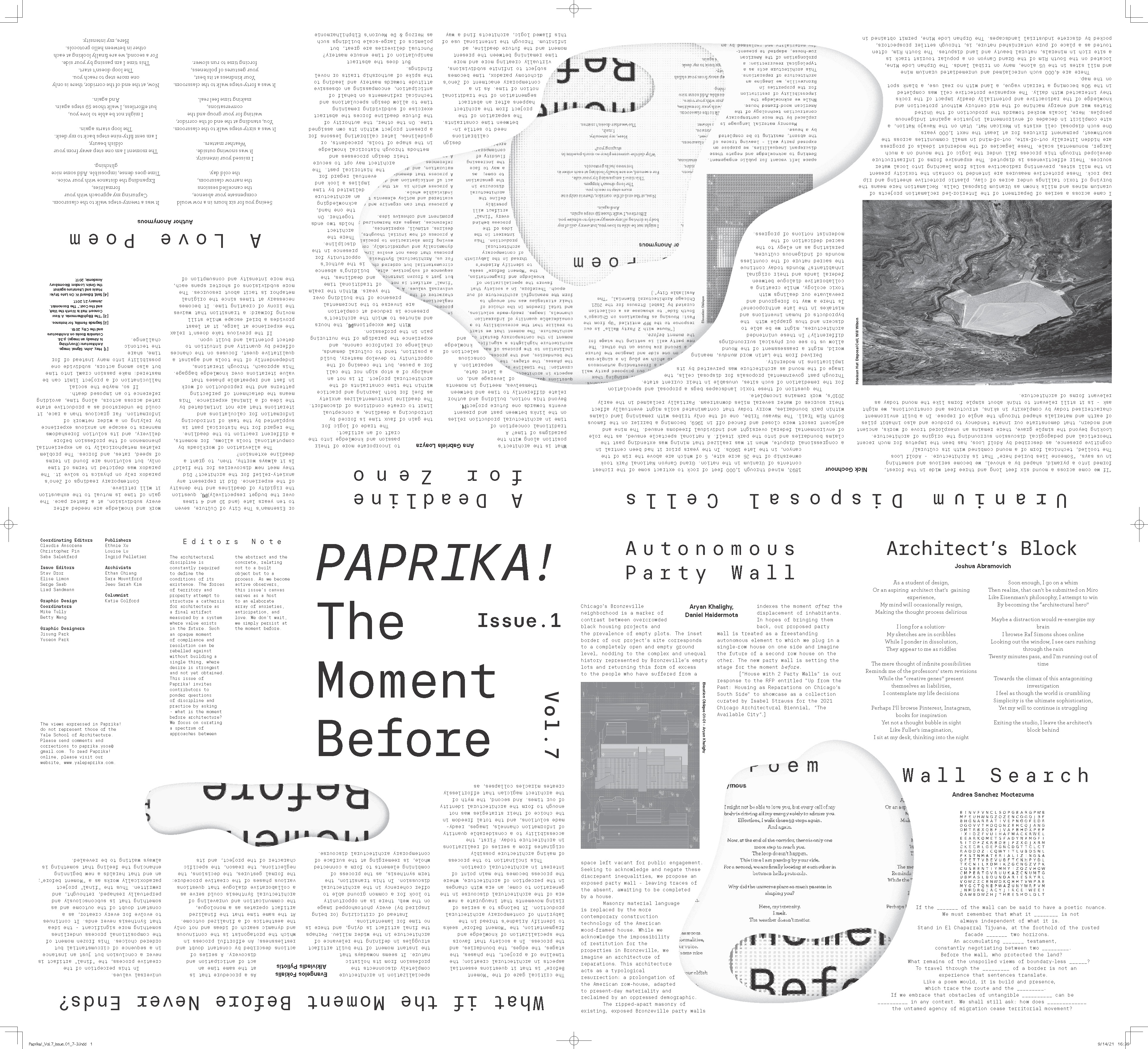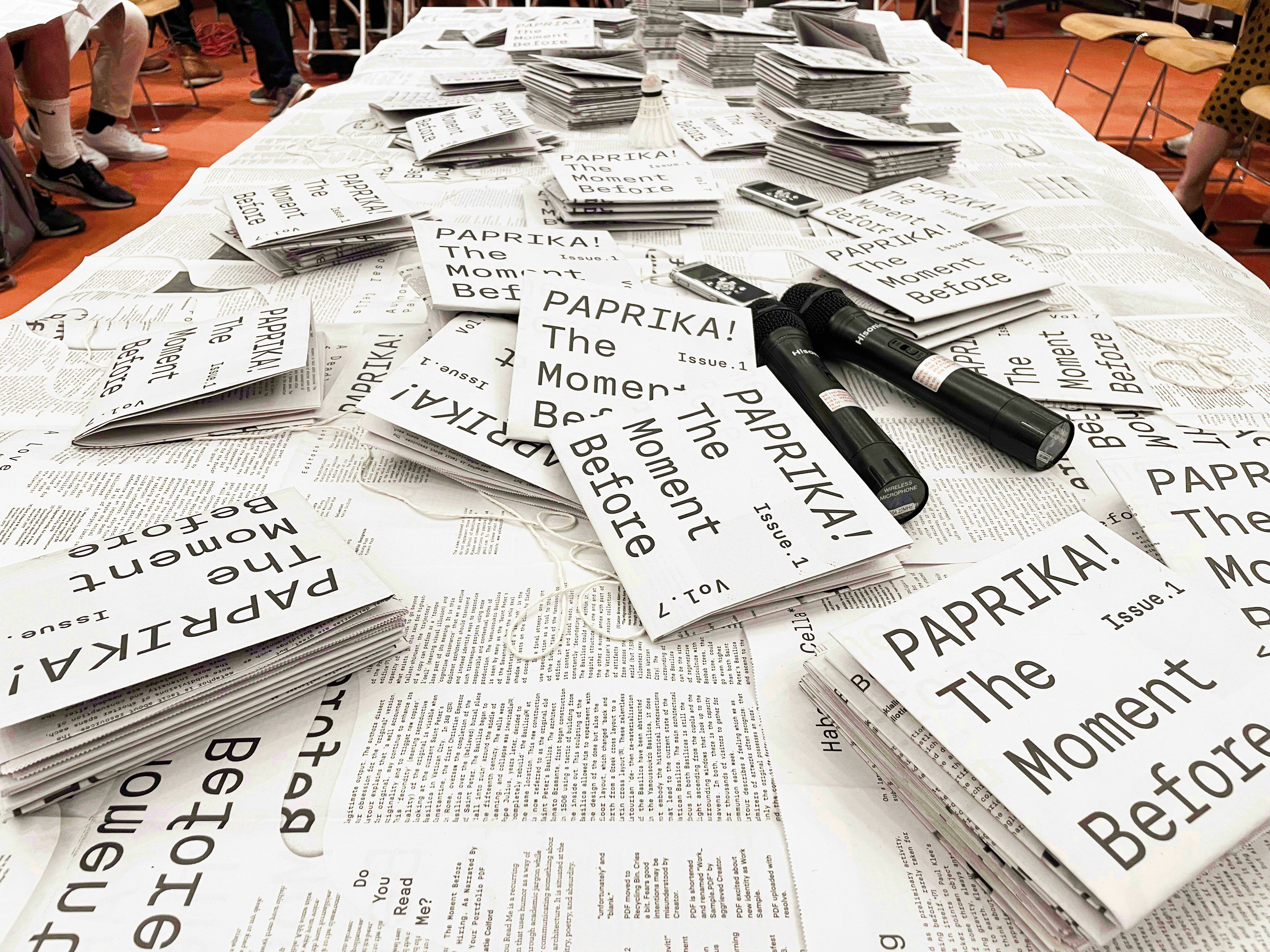This issue of Paprika asks contributors to discuss the challenges facing architecture at present through the moment before. Using it as a tool to question how we practice and how we conceive of architecture itself, we ask – what use is the moment before architecture? We encourage contributors to submit texts and other media alike, exploring the moment before language as an inherent facet of the subject matter. Collecting different media allows for varying curatorial and editorial organizations, which may take form first as a magazine and translate into an exhibition.
