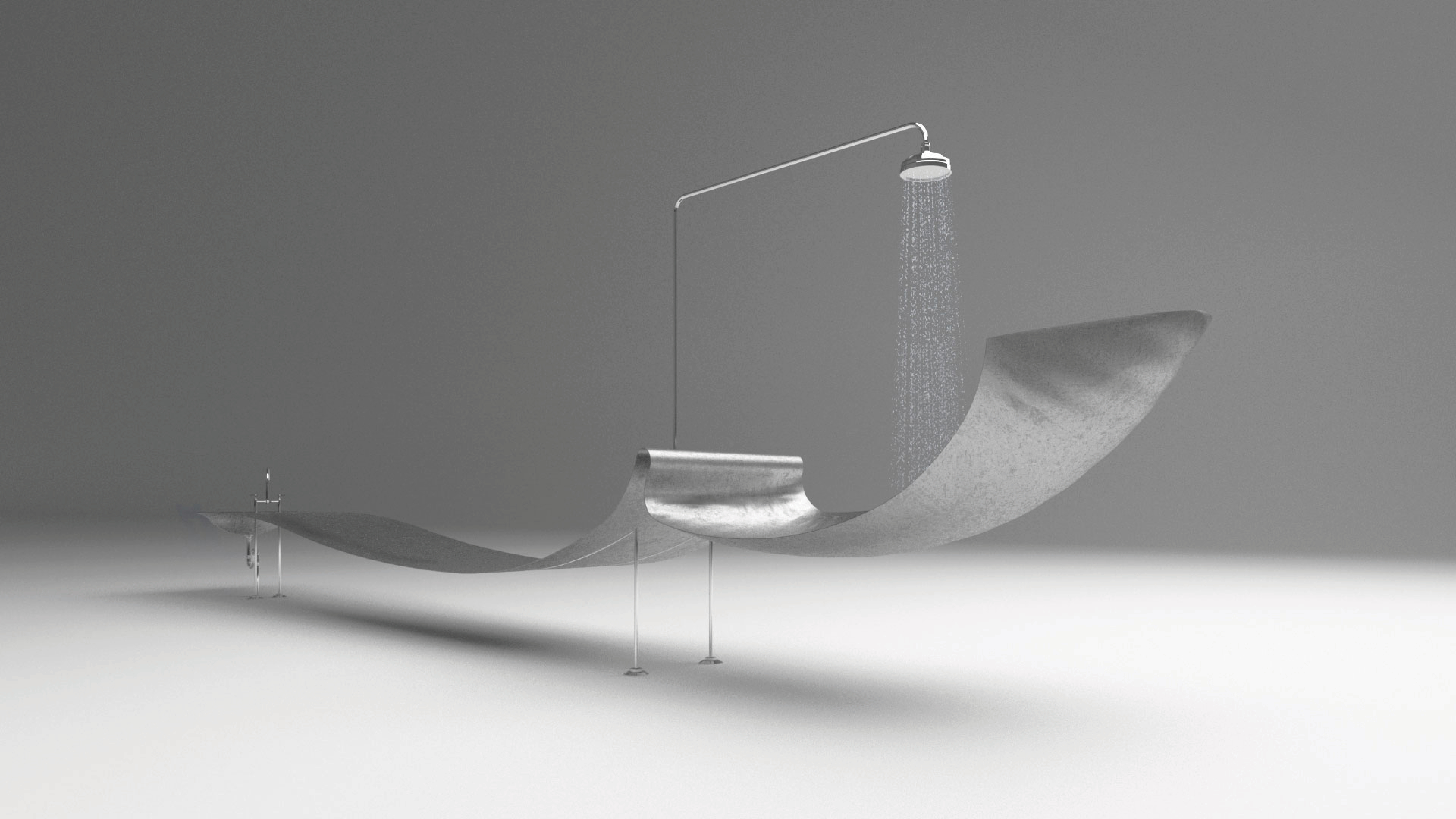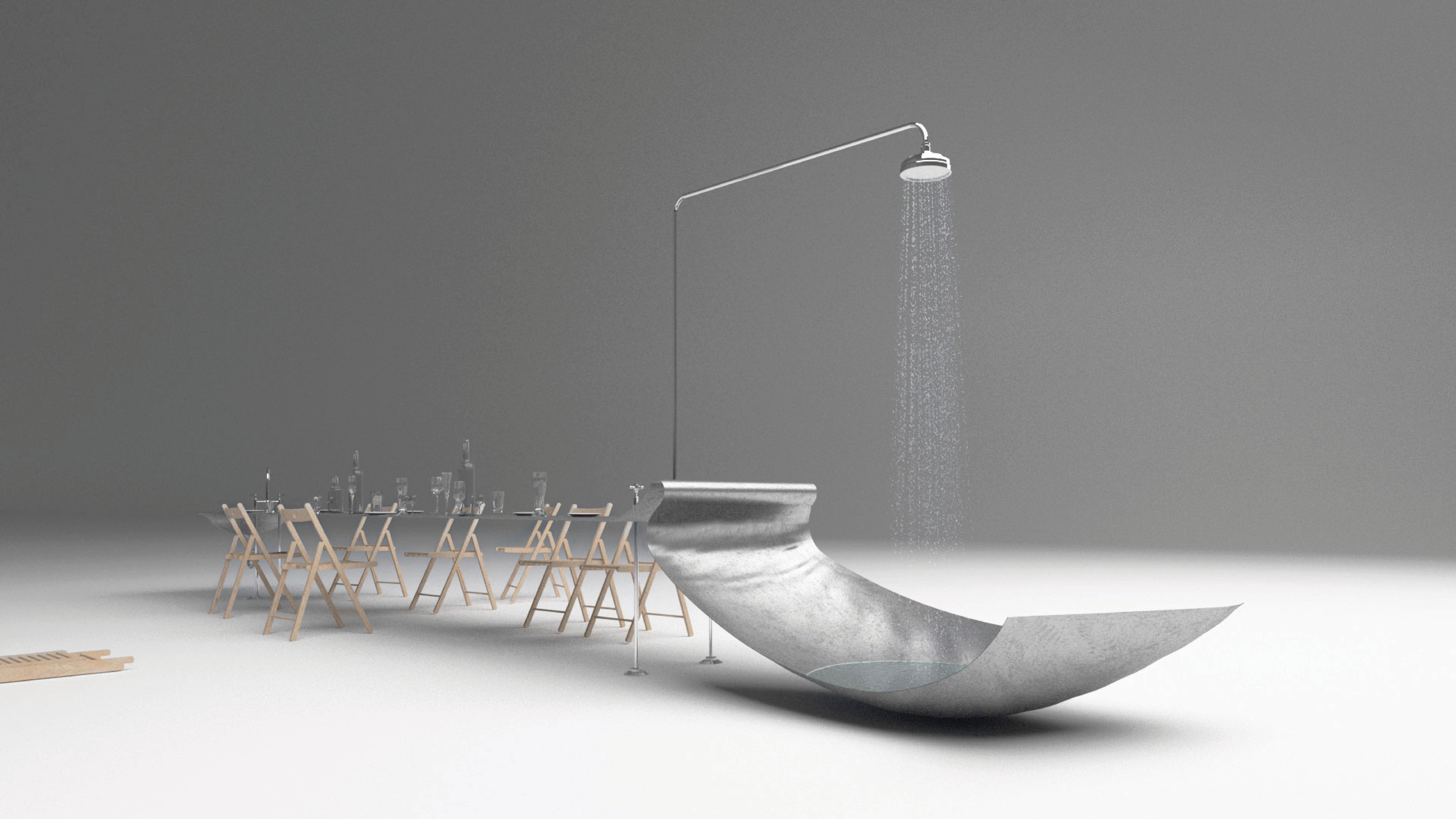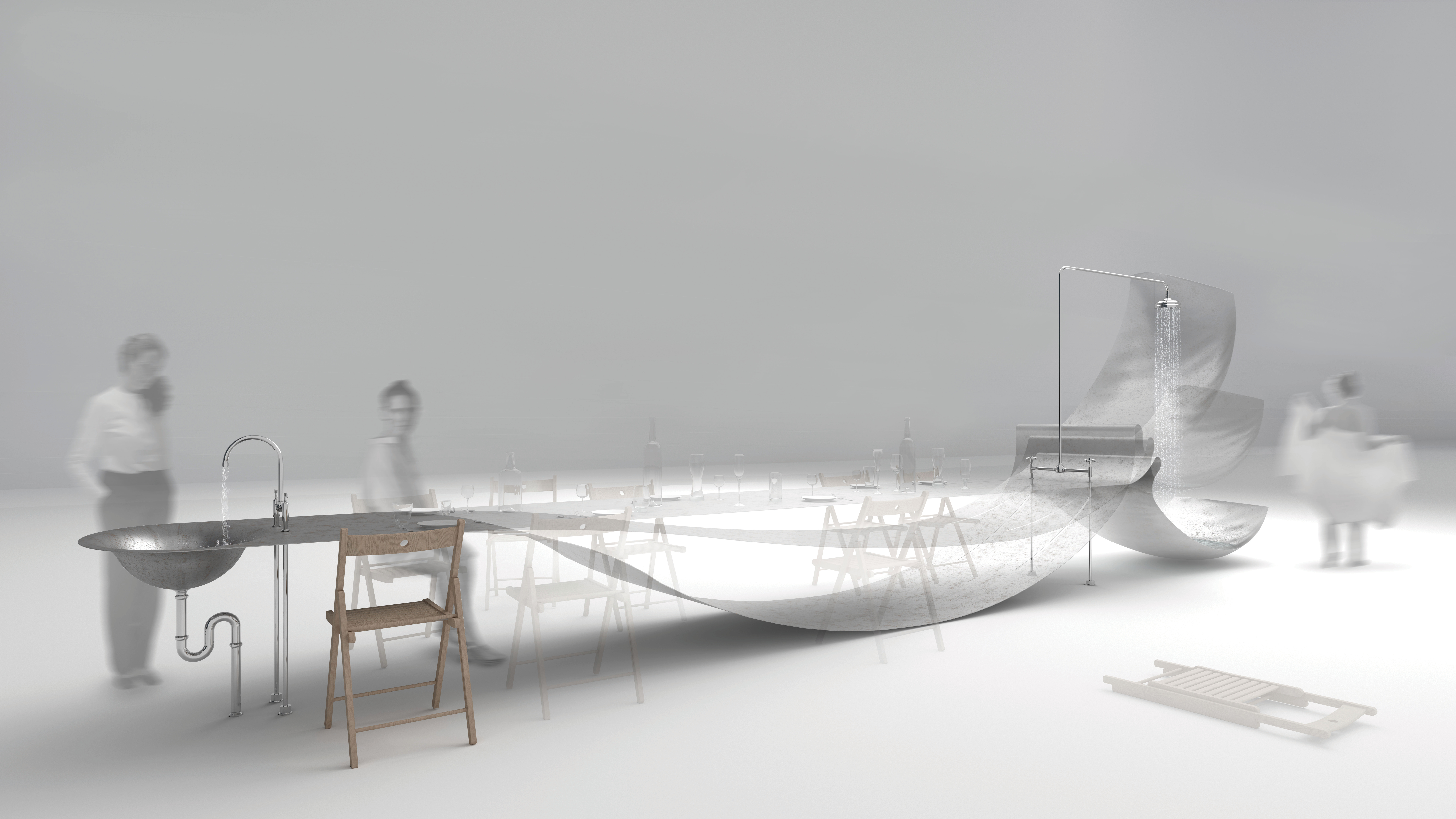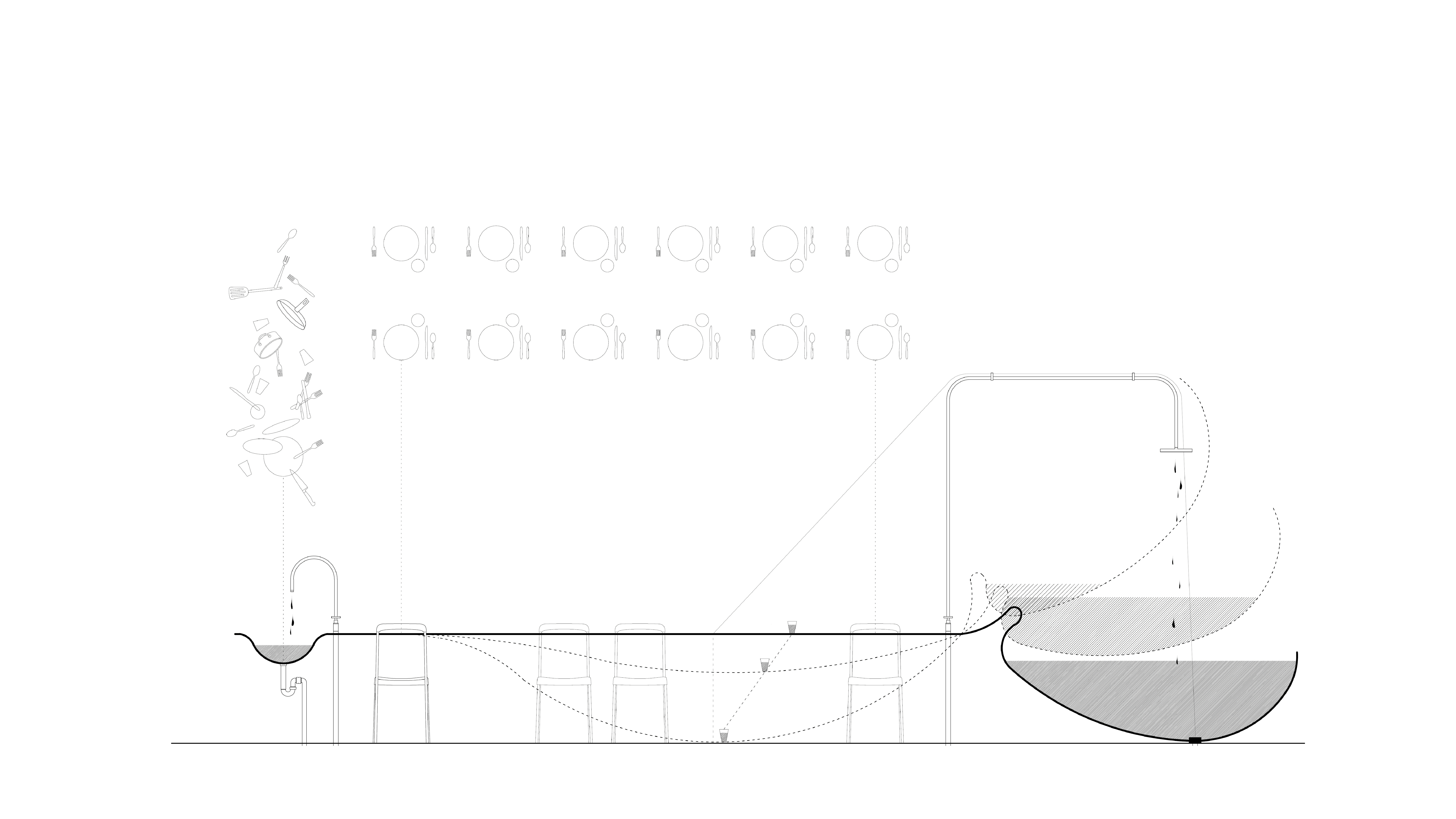 The table is made of a single sheet of metal, bent into a washing basin, an elongated surface, and a bathtub. It is anchored by two faucets, making water an infrastructural, load-bearing, and programmatic element at once. While seeking unification, the Dinner Table defines a conflict between its changing program and its scheduled form. The proposed reversal of the Corbusian scheme produces a singular object whose unified nature re-examines the 20th-century modernist paradigm of separation, while holding the role of a producer of events, a place of hygiene, and a site for the female figure to reclaim a seat at the table and redefine her inhabitancy.
