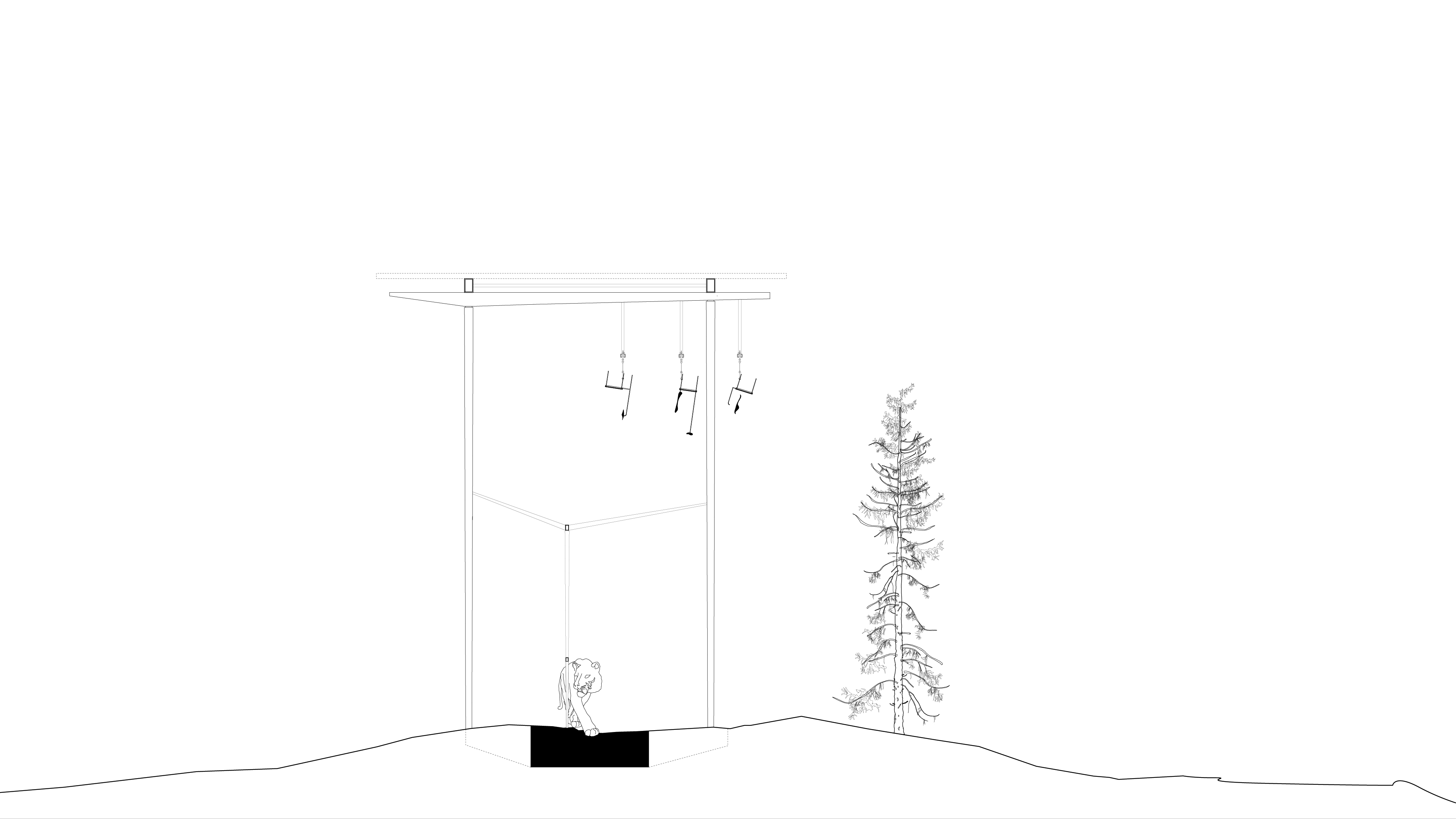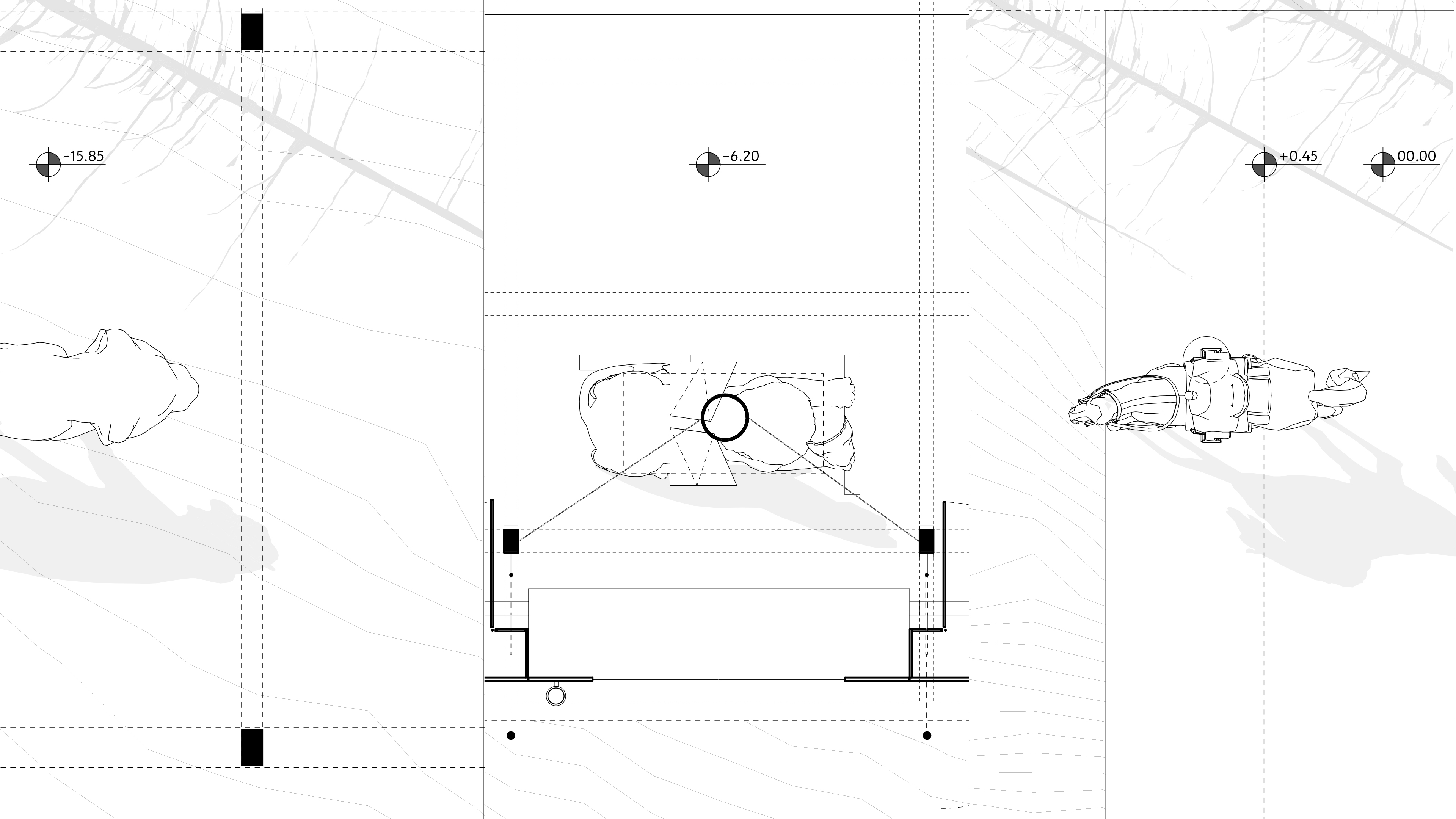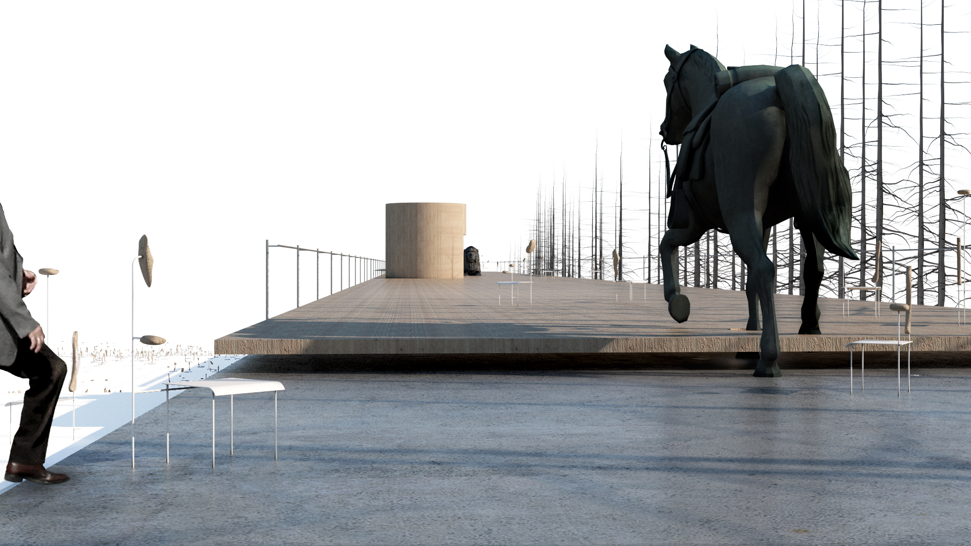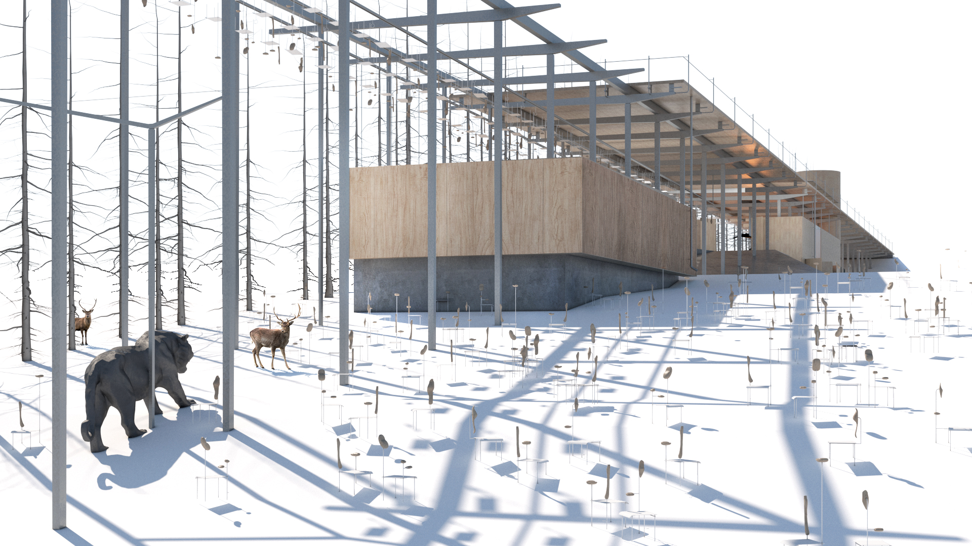 Situated in the Oslo forest, the project examines the ancient program of conflict in landscape. The clearing’s inherent quality of emptiness is the spatial and programmatic starting points of a linear parliament. Its tectonic logic is reversed – there are no rooms but rather an exterior that is never fully enclosed, remaining in an almost-interior state.